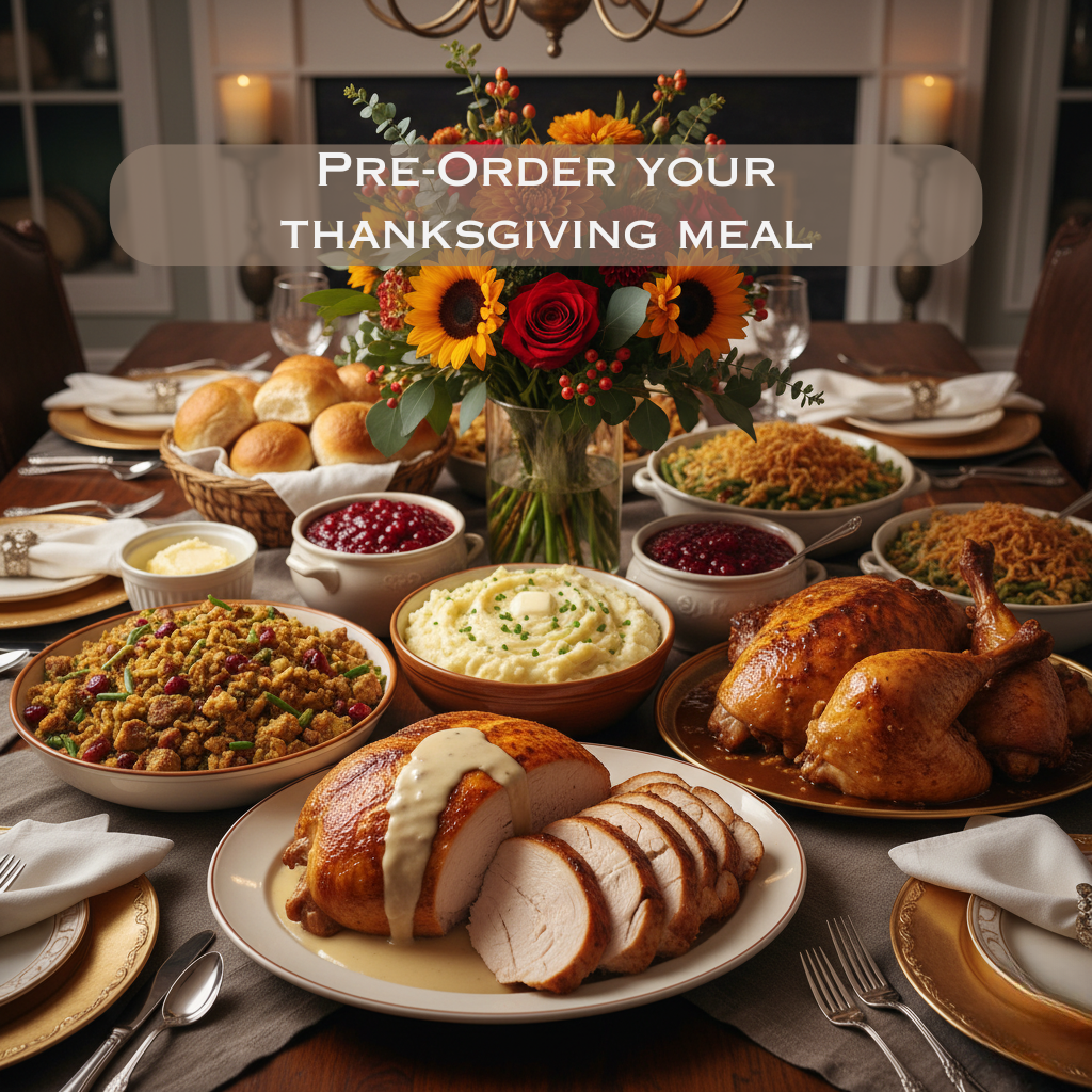 - Roasted turkey breast with white gravy, roasted dark meat with dark gravy, and traditional holiday sides.